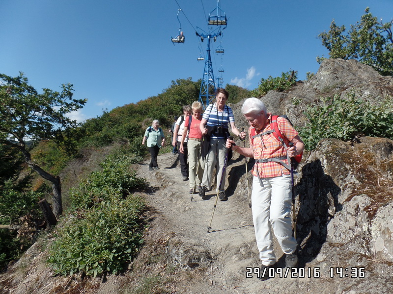 Gedeonseck, mit phantastischem Blick auf den Rhein, war es schon recht warm. Als alle Wanderer versammelt waren, teilten sie sich auf: Einige wollten mit der Sesselbahn nach Boppard hinunterfahren, die anderen lieber hinuntergehen. Der Wanderweg von ca. 1,5 km Länge führt hier steil bergab auf felsigem Untergrund, wobei der Höhenunterschied über 200 m beträgt. Der Abstieg war eine Herausforderung aber einmal begonnen, gab es kein Zurück mehr. Gottlob kamen alle heil in Boppard an. Für diese Wanderer blieb nur noch wenig Zeit zum Kaffee trinken während die anderen sich doch einige Sehenswürdigkeiten anschauen konnten. Entlang des Rheins fuhr der Bus dann über Koblenz wieder zum Hotel zurück. Nach dem Abendessen wurde ausgiebig mit Gitarrenbegleitung gesungen. Jeder Teilnehmer konnte sein Lieblingslied vorschlagen. Der Himmel war grau, als man am vierten Tag die kurze Strecke über Vallendar zum Wallfahrtsort Schönstatt zurücklegte. Nach Besichtigung der großen Pilgerkirche, die 1.300 Gläubige aufnehmen kann, wanderte Gruppe 1 von dort auf dem Rheinsteig zur Festung Ehrenbreitstein (ca. 8 km), während Gruppe 2 bis Urbar weiterfuhr und schon nach 3 km das ehemalige Gelände der Bundesgartenschau Koblenz 2011 erreichte. Unterwegs setzte leider Regen ein. Er wurde immer stärker je näher wir dem Ziel kamen. Die Aussichtsplattform bot etwas Schutz aber der Blick auf Koblenz und das Rhein- und Moseltal war leider getrübt. Zum Glück fand sich ein trockenes Plätzchen zum Vespern und im Bus konnte der Rucksack deponiert werden bevor es zur Besichtigung der Festung ging. Die Anlage ist riesig und die mächtigen Mauern beeindruckend. Die wechselvolle Geschichte wird anschaulich dargestellt. Ein Blick von der Terrasse aufs Deutsche Eck erinnerte an den Stadtrundgang durch Koblenz. Zurück ging dann die Fahrt nach Grenzau, wo man sich Kaffee und Kuchen im urigen „Alten Gasthaus“ (Baujahr 1631) schmecken ließ. Inzwischen schien sogar die Sonne und mancher stieg noch hinauf zur Burgruine mit dem einzigen dreieckigen Bergfried in Deutschland. Andere schlenderten durch den kleinen Ort. Danach war Koffer packen angesagt. Das letzte Abendessen – Sauerbraten, Knödel und Rotkraut – schmeckte wieder vorzüglich. Leider setzte in der Nacht Regen ein.