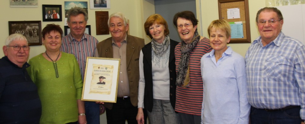 Auf dem Terminplan stand am 6.1.2016 „Volkstanz“. Siegbert Genzwürker war völlig ahnungslos und überrascht. Nicht nur die Volkstänzer waren im Vereinsraum im alten Schulhaus versammelt, sondern auch das ganze AV-Team, um ihm zum 40jährigen Jubiläum als Vorsitzender der OG Möckmühl zu gratulieren. Seit 1.1.1976 ist er im Amt, sicherlich kommt das unter den 570 Ortsgruppen des Schwäb. Albvereins nicht häufig vor. Als Dank für seine verdienstvolle Arbeit und zur Erinnerung an diesen Tag wurden ihm eine Ehrenurkunde der OG sowie ein Theatergutschein überreicht. Seine Frau Margarete, die ihn in all den Jahren tatkräftig unterstützt hat, erhielt einen Blumenstrauß. Die stellv. Vorsitzende erinnerte an Ereignisse aus vier Jahrzehnten: 480 Monatswanderungen wurden durchgeführt, bei denen er auch oft als Wanderführer aktiv war. Auf etwa 20 Aufenthalte in Wanderheimen – meistens auf der Schwäbischen Alb aber auch im Schwarzwald und im Pfälzer Wald – folgten später Wanderreisen in verschiedene Regionen Deutschlands. Im April 1976 wurde die Volkstanzgruppe wieder ins Leben gerufen. Auch sie kann demnächst ihr 40jähriges Bestehen feiern. 1979 erhielten Tänzer und Spieler anlässlich der 1200-Jahrfeier der Stadt Möckmühl eine Tracht. In den folgenden Jahren, bis ca. 2005, trat die Gruppe häufig in der näheren und weiteren Umgebung auf. Unvergessen sind die Fahrten zum Oktoberfest nach München 1982 und 1989 mit Teilnahme am großen Festzug, die Auftritte beim Backofenfest in Wackershofen oder bei den Baden-Württembergischen Heimattagen, beim Schäferlauf in Markgröningen, in Baden-Baden, bei der 1200 Jahrfeier in Möckmühl, anfangs auch beim Stadtfest. Versucht man die Übungsabende in diesen Jahren zu zählen, die anfangs noch alle 14 Tage abgehalten wurden, kommt man leicht auf 700. Auch heute noch treffen sich 8 Paare einmal im Monat zum Tanzen, allerdings nur noch zum eigenen Vergnügen. Schon seit Anfang der 80er Jahre ist der Albverein beim Stadtfest mit einem Stand vertreten, hat aber auch vorher schon beim Weinfest mitgeholfen. Geschätzte 30.000 Waffeln wurden seit 1990 gebacken! Ein Großereignis war das 100jährige Jubiläum der Ortsgruppe, das 1989 in der Stadthalle gefeiert wurde. Auch der 2014 ausgerichtete Wandertag des Heilbronner Gaus war eine Herausforderung, die man gemeinsam bewältigte. Über mehrere Jahre beteiligte sich die Ortsgruppe am Kinderferienprogramm der Stadt Möckmühl und ist nach fast 30 Jahren immer noch bei den Pflegearbeiten im Hergstbachtal dabei. Im Winterhalbjahr trifft man sich alle 14 Tage zum Singen und Reden und oft werden auch Dias von den vielen Wanderreisen und Wanderungen gezeigt, an die man sich gerne wieder erinnert.