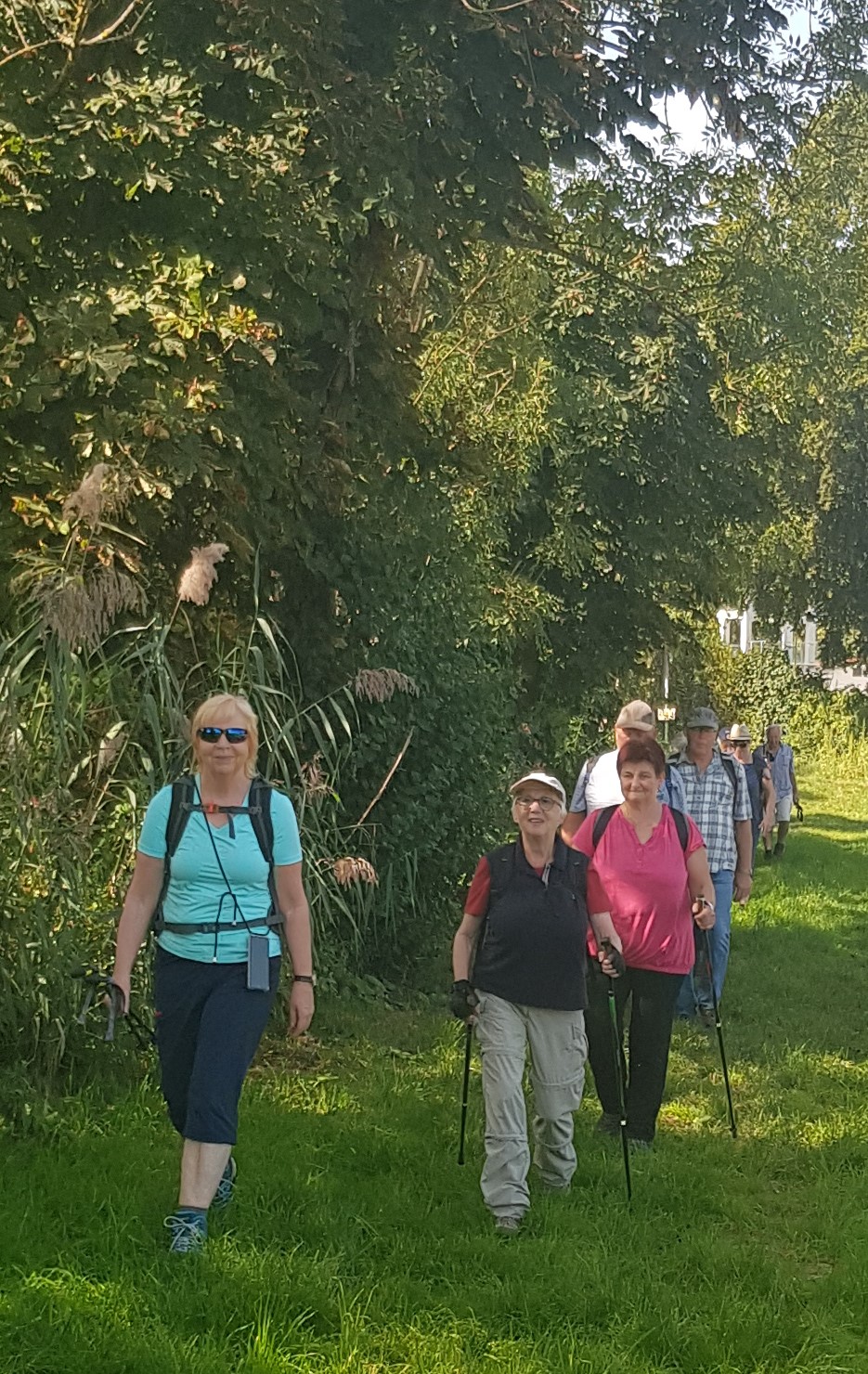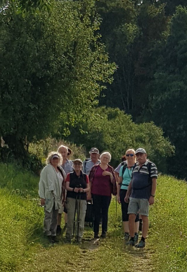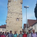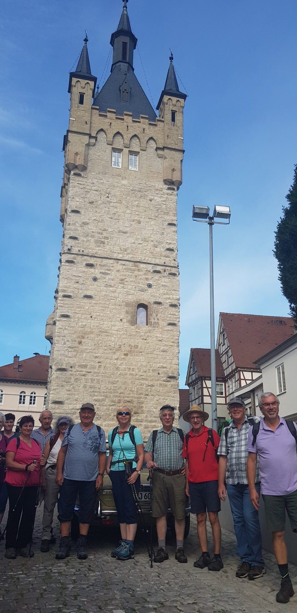 Am 17. September startete Heinz Schellenbauer mit 13 Teilnehmern am Bahnhof in Bad Wimpfen, auf die 14 km lange Strecke. Nach einem Abstecher durch die Kaiserpfalz in Wimpfen und einem Fotostopp am Blauen Turm ging es weiter in Richtung Freibad. Am Neckar entlang erreichten wir Heinsheim. Dort haben wir die Bergkirche besichtigt. Weiter gings zum Jüdischen Friedhof, wo es einige interessante Erläuterungen gab. Nächstes Haltepunkt war die Burg Guttenberg wo es einiges zu erzählen gab. Aber auch die schöne Aussicht haben wir genossen. Aufgrund der hochsommerlichen Temperaturen waren alle froh, gegen 16 Uhr, den Weinpavillon in Gundelsheim zu erreichen. Bei einem Glas Wein und gutem Essen konnte wir den Abschluss der Wanderung genießen. hs Fotos: Heinz Schellenbauer