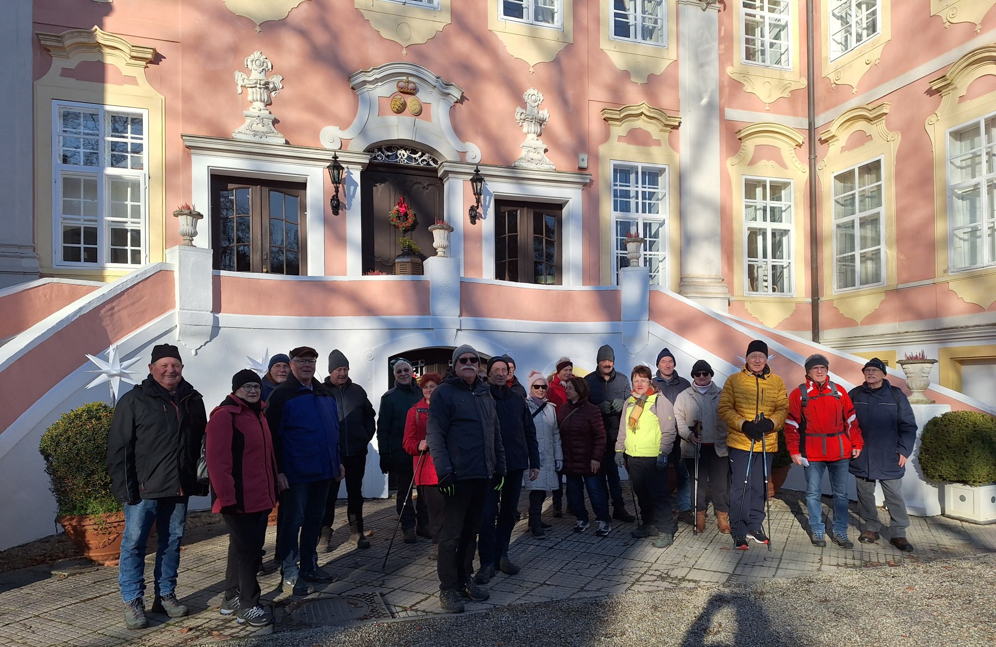 Am 10.01. 2025 trafen sich 23 Wanderer bei schönem, aber kalten Wetter in Züttlingen zur Wanderung. Zuerst besuchten wir die Grabkapelle und Gräber der Freiherren von Ellrichshausen auf dem Züttlinger Friedhof. Weiter ging es zum Schloss Assumstadt, das Karl Reinmund von Ellrichshausen, 1769 von der Kaiserin Maria Theresia, für seine Verdienste geschenkt bekommen hat. Die Wanderung führte uns über den Seehof, der bereits im 16. Jahrhundert besiedelt wurde. Beim Schloss Domeneck erzählte uns die Schlossherrin interessante Geschichten, von Menschen und Ereignissen, aus den vergangen 700 Jahren der Anlage. Die im Bauernkrieg 1525 zerstörte Burg wurde nicht mehr aufgebaut und durch das Schloss Domeneck ersetzt. Bei der anschließenden Schlusseinkehr waren alle der Meinung, dass wir über unsere nähere Heimat viel neues erfahren haben.