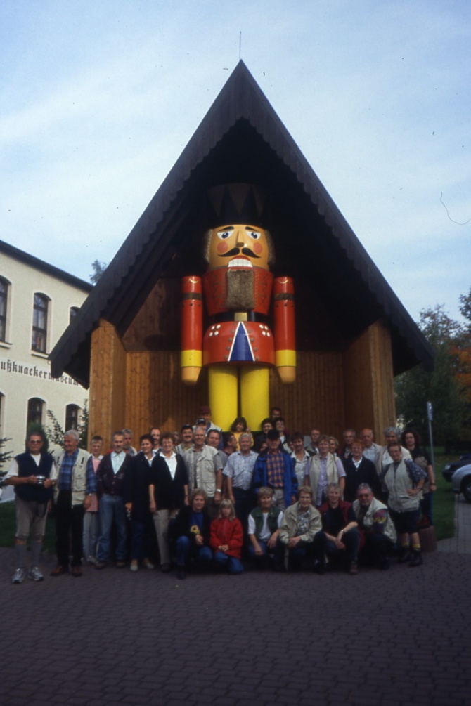 10 Jahre nach der Wiedervereinigung war man neugierig auf den Osten Deutschlands und so machten sich 47 Wanderfreudige auf den Weg ins Erzgebirge. Die Reise wurde vom Schreibtisch aus von Hansl Hof und Marlies Kibler geplant und sie versuchten möglichst viele unbekannte Ziele einzubauen. Die Fahrt führte über Würzburg – Bamberg – Plauen zur Talsperre Pöhl. Nach dem Rucksackvesper wurde eine schöne Wanderung auf dem Jocketaer Panoramaweg unternommen. Auf dem Weg zum Quartier machten wir noch einen Abstecher zur Göltzchtalbrücke im Vogtland. Die größte Ziegelbrücke der Welt konnten wir von allen Seiten bestaunen, ein beeindruckendes Meisterwerk. Dann ging es über Chemnitz und Tschopau zum Hotel „Gasthof zur Heinzebank“ bei Hilmersdorf, das an einer uralten Wegkreuzung der Silberstraße liegt. Seiffen, das Spielzeugdorf, ist ein weltbekanntes Zentrum erzgebirgischer Volkskunst und durfte im Programm nicht fehlen. Von Oberneuschönberg aus führte uns die Wanderung in die Ortsmitte, wo eine Fahrt mit der „Seiffener „Bimmelbahn“ gebucht war. Sie brachte uns zu den schönsten und markantesten Sehenswürdigkeiten in Seiffen und der näheren Umgebung. Danach konnte jeder auf eigene Faust den Ort erkunden, das Spielzeugmuseum besichtigen und natürlich die Rundkirche, der Schauwerkstatt einen Besuch abstatten und in den vielen Läden einkaufen. Ein weiteres Highlight an diesem Tag war das Nussknackermuseum im benachbarten Neuhausen. Hier gab es über 2.600 Nussknacker zu bestaunen, zwischen 9 mm und 5,87 m groß. Am nächsten Morgen ging die Fahrt zunächst zum Basaltaufbruch durch den Erzgebirgsgneis am Hirtstein bei Satzung, ein Naturwunder. Entstanden ist er vor 70 Millionen Jahren. Der Basalt erstarrte fächerförmig bzw. liegend, eine geologisch einmalige Besonderheit in Europa.Leider begann es nun stark zu regnen und man beschloss das Programm zu ändern und zuerst nach Annaberg-Buchholz zu fahren. Wahrzeichen der Stadt ist die spätgotische St.-Annenkirche, die größte Hallenkirche Sachsens. Bei einer Führung wurden uns viele Details im beeindruckenden Kirchenraum gezeigt und erläutert.