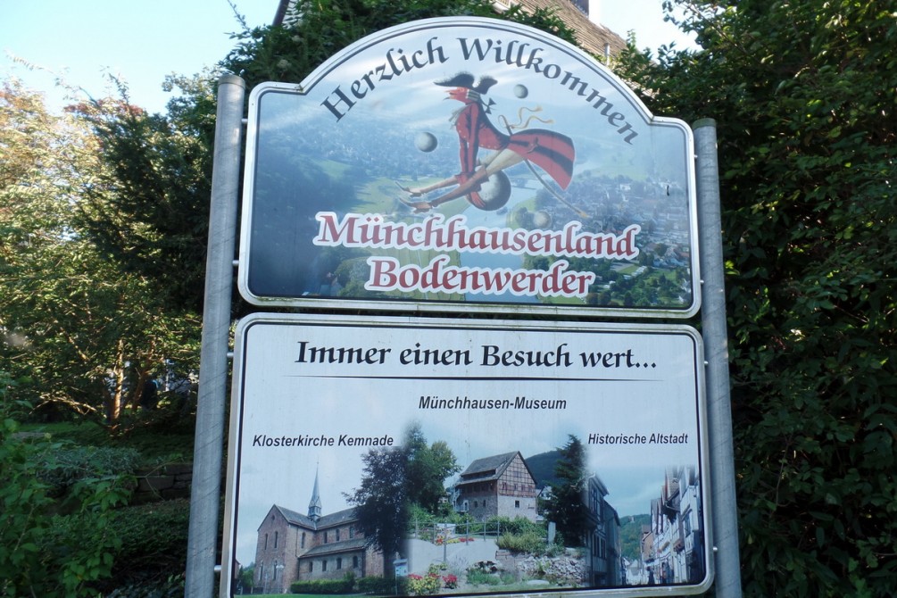 Am dritten Tag wanderte Gruppe 1 vom Hotel aus zunächst nach Hehlen. Gleich am Anfang war ein steiler Anstieg zu bewältigen und man musste sich den Weg durch Brombeerranken bahnen. In der achteckigen Immanuel-Kirche in Hehlen konnten die Wanderer an einer Andacht teilnehmen, die eine Pilgergruppe dort abhielt. Durch die Weserauen führte der Weg nach Bodenwerder zurück und man gönnte sich nach 5 Stunden Wanderung erst mal einen Kaffee in der Fußgängerzone. Auch Gruppe 2 besichtigte die Immanuelkirche, ließ sich allerdings vom Bus dort absetzen. Dann warf man zuerst einen Blick auf das in Weserrenaissance erbaute Schloss in Hehlen, bevor man die Weser überquerte und ihrem Lauf bis Bodenwerder folgte. Es war richtig warm geworden als man die lange Brücke nach Kemnade überquerte. Leider war die Kirche, in der Baron von Münchhausen begraben ist, geschlossen, so dass man ohne Vesperpause den letzten Kilometer bis Bodenwerder zurücklegte und sich dort stattdessen Kaffee und Kuchen schmecken ließ. Um 16 Uhr traf sich die ganze Gruppe noch einmal im Münchhausen Museum und man erfuhr bei einer Führung viel Interessantes aus dem Leben des „Lügenbarons“ und über die Entstehung des kleinen Städtchens Bodenwerder.
